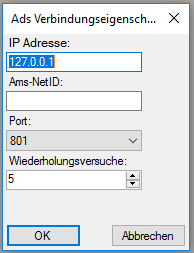- Port: Kommunikationsport der Beckhoff SPS (z. B. 801 für SPS LaufzeitSystem 1)