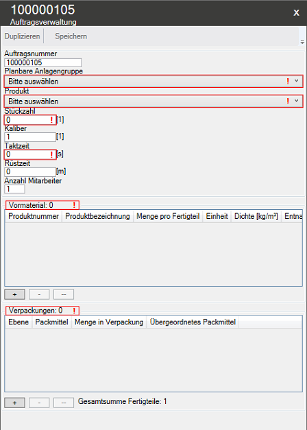 Um nicht alle Angaben zum Erstellen eines Fertigungsauftrags manuell eingeben zu müssen, kann ein bestehender Auftrag aus der Liste markiert und über Duplizieren kopiert werden. In diesem Fall müssen nur noch die Änderungen gegenüber der Vorlage eingetragen werden.