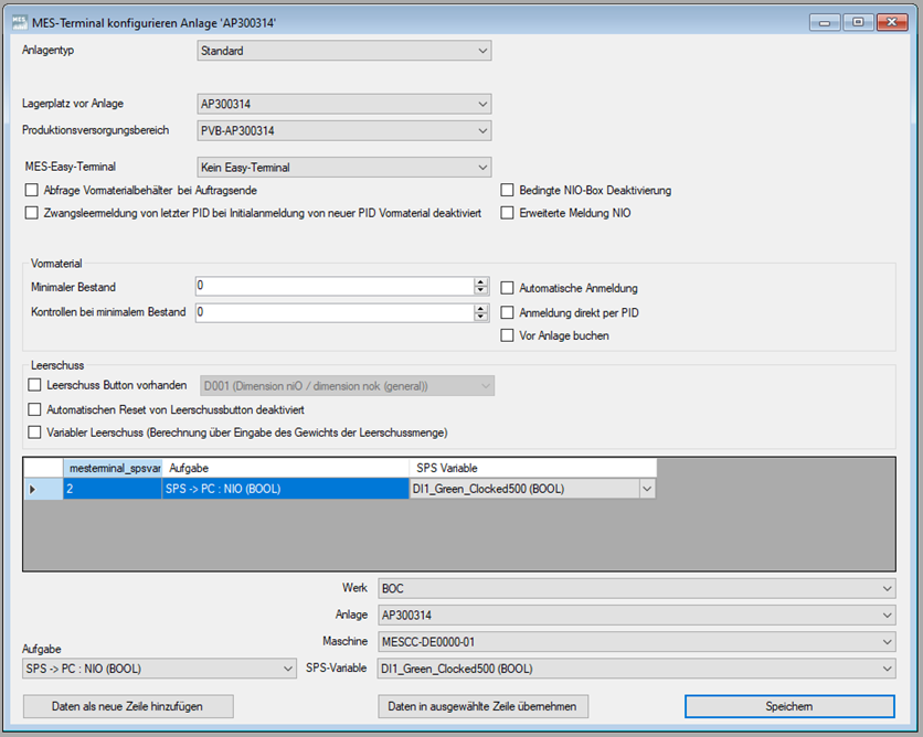 Über das Menü MES-Terminal konfigurieren wird das zur jeweiligen Anlage gehörige MES-Terminal eingerichtet. Dabei müssen die nachfolgend erläuterten Angaben gemacht werden.