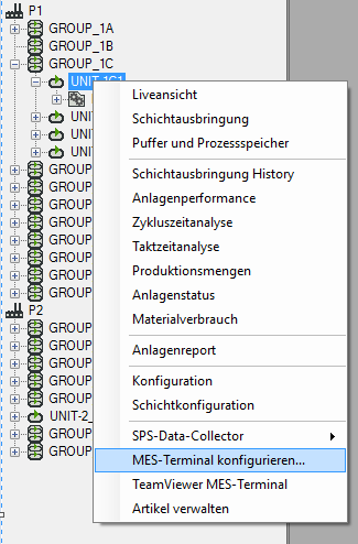 Klicken Sie mit der rechten Maustaste auf die Anlage deren MES-Terminal bearbeitet werden soll und wählen Sie das Menü MES-Terminal konfigurieren.