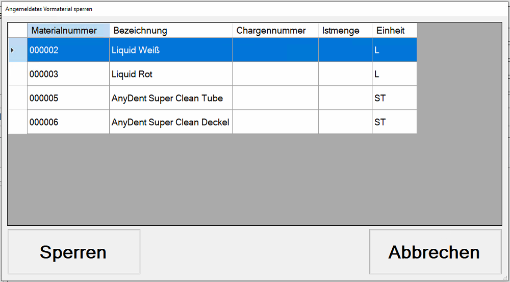 If, for example, it is determined that the starting material on the line is defective, it can be blocked for further use via this menu. Via the button block the material marked in the list is blocked.
