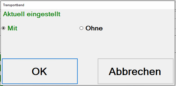 The option With (conveyor belt) describes the normal situation, i.e. that NIO products identified by the system are automatically sorted out into the NIO container 1. The option Without (conveyor belt) is used for the correct detection of the NIO components if a product has to be removed manually. In this case, components are not rewritten from IO to NIO until the worker has sorted out the number of products recognized by the system as NIO through the light barrier into the NIO container 2.