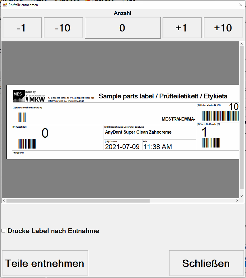 Via the menu Remove test parts the removal of parts for test purposes (e.g. QM) can be booked. The -X/+X keys can be used to define the number of components taken. Via the function Take out parts the defined number is subtracted from the total of finished parts. If the option Print label after withdrawal was previously selected, the label displayed in the preview for labeling the test part HU is automatically printed when the withdrawal is posted.