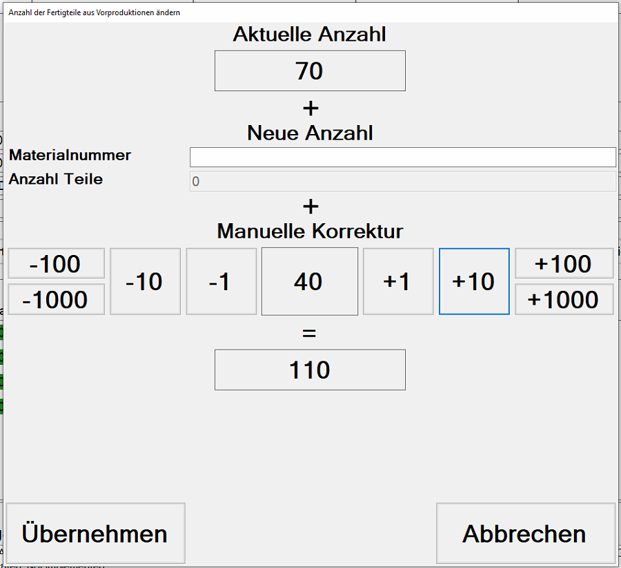 In the adjacent example, this means: Currently 70 finished parts plus 40 additional parts results in a total of 110 parts.\